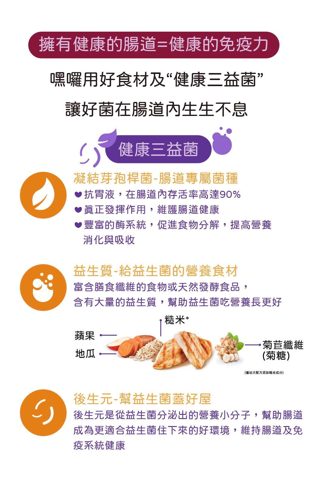 【成分】新鮮雞肉,甘薯,鷹嘴豆,馬鈴薯,啤酒酵母粉,扁豆,豬肉,雞脂(以綜合維生素E保存),亞麻籽,紅蘿蔔,蘋果,天然香料,豌豆,